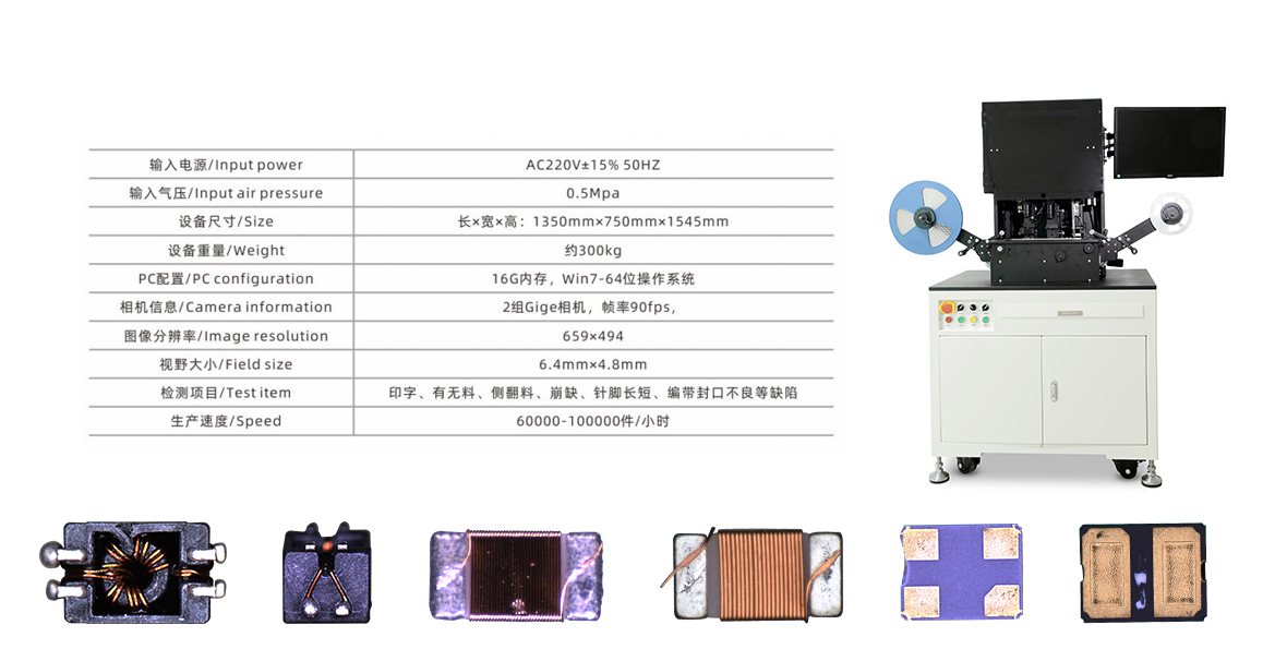 編(biān)帶檢測設備(bèi) 檢測項目:印字、有無料、側翻料、崩缺、針腳長短 、編(biān)帶封口不良等缺陷